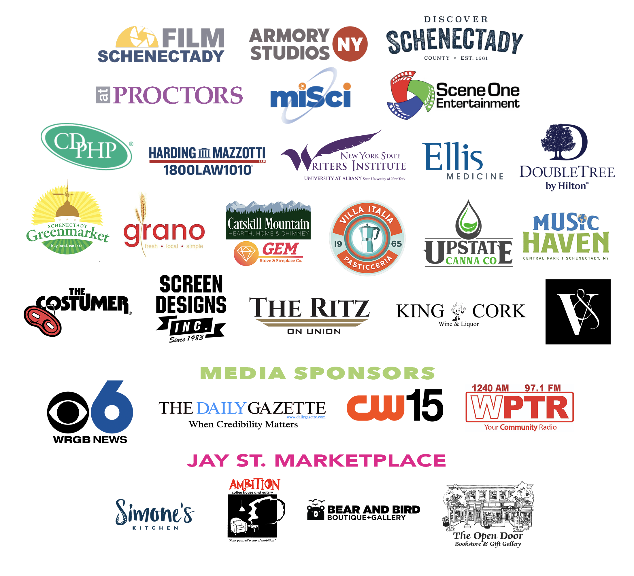 we thank our sponsors for their MISSION CRITICAL SUPPORT FILM SCHENECTADY SCENE ONE ENTERTAINMENT GEM STOVE & FIREPLACE ARMORY STUDIOS NY THE RITZ THE DAILY GAZETTE SIMONE'S KITCHEN CDPHP SCHENECTADY GREENMARKET DOUBLE TREE BY HILTON DISCOVER SCHENECTADY HARDING & MAZZOTTI VILLA ITALIA SCREEN DESIGNS WRGB CBS 6 KING CORK WINE & LIQUOR PROCTORS CW 15 AMBITION COFFEE HOUSE & BISTRO ELLIS MEDICINE NYS WRITERS INSTITUTE THE COSTUMER GRANO BEAR AND BIRD BOUTIQUE AND GALLERY UPSTATE CANNA CO miSci MUSIC HAVEN VICE & VIRTUE WPTR THE OPEN DOOR BOOKSTORE & GIFTS